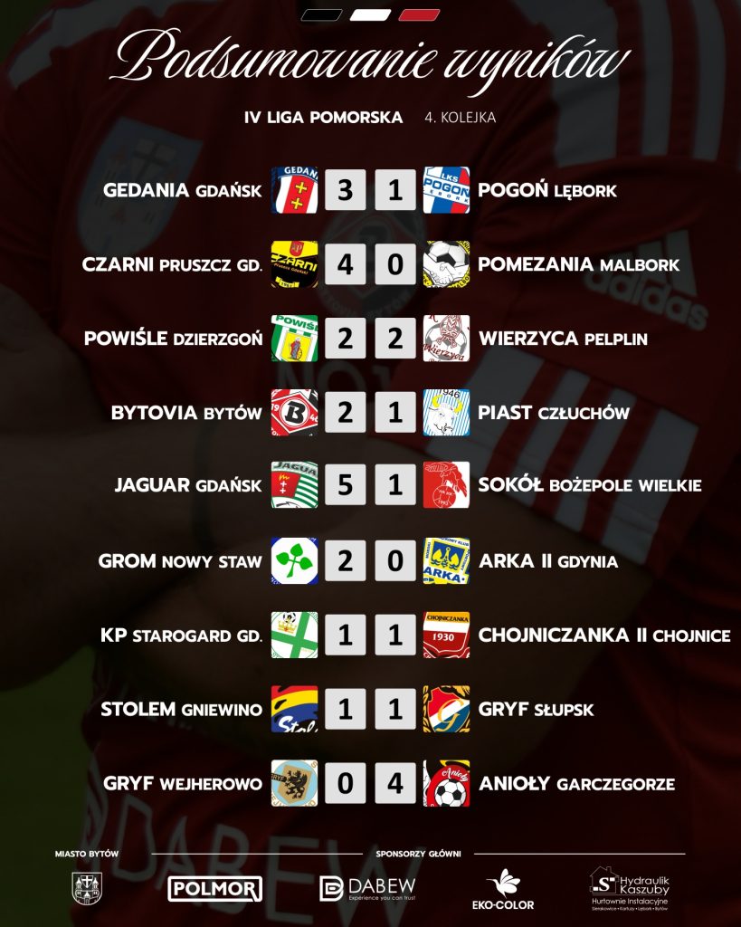 Seniorzy 4 LIGA / 4 KOLEJKA – WYNIKI 28 sierpnia 20253824 Za nami 4 kolejka ligowych zmagań. Na grafice prezentujemy wszystkie jej wyniki.