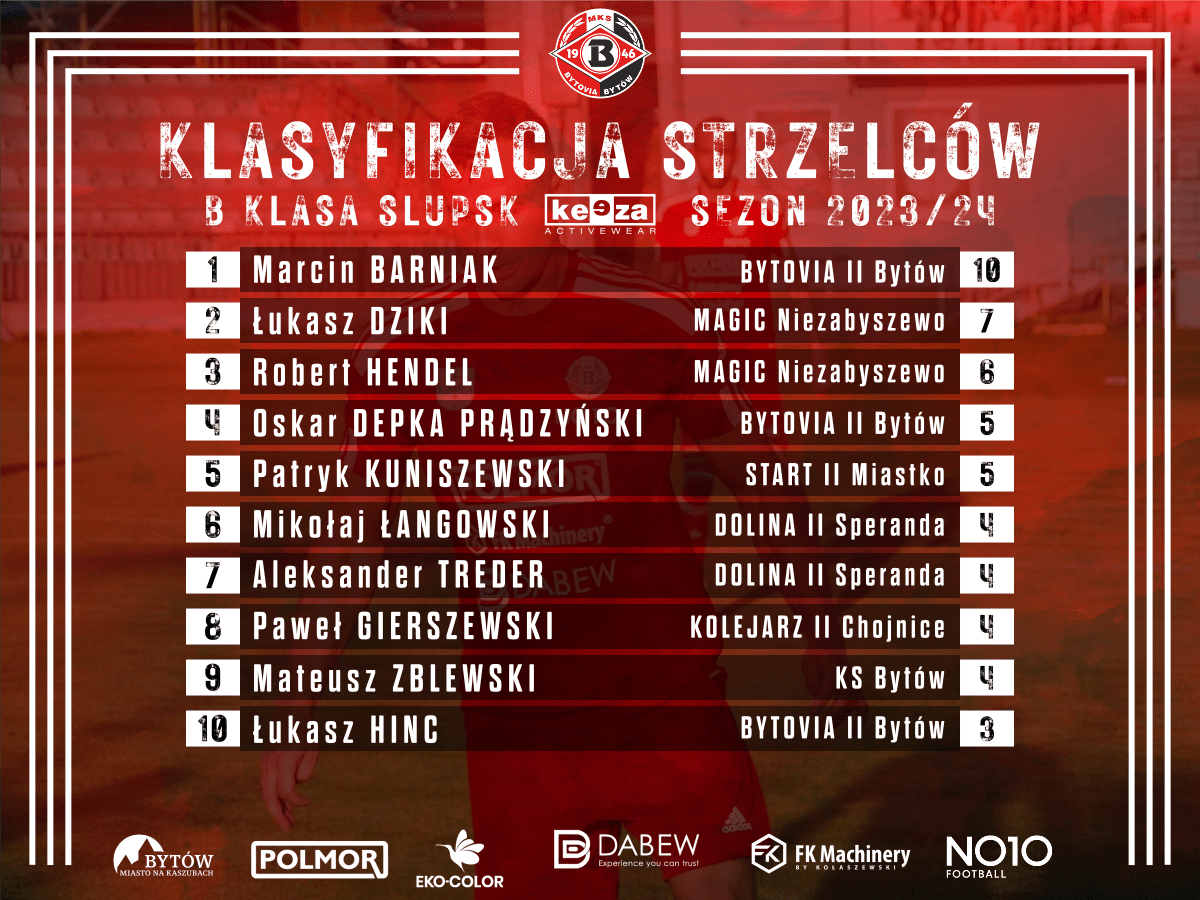 Na poniższej grafice liderzy klasyfikacji strzelców KEEZA B-klasy Pomorskiej, a w TOP10 znajduje się 3 naszych zawodników!