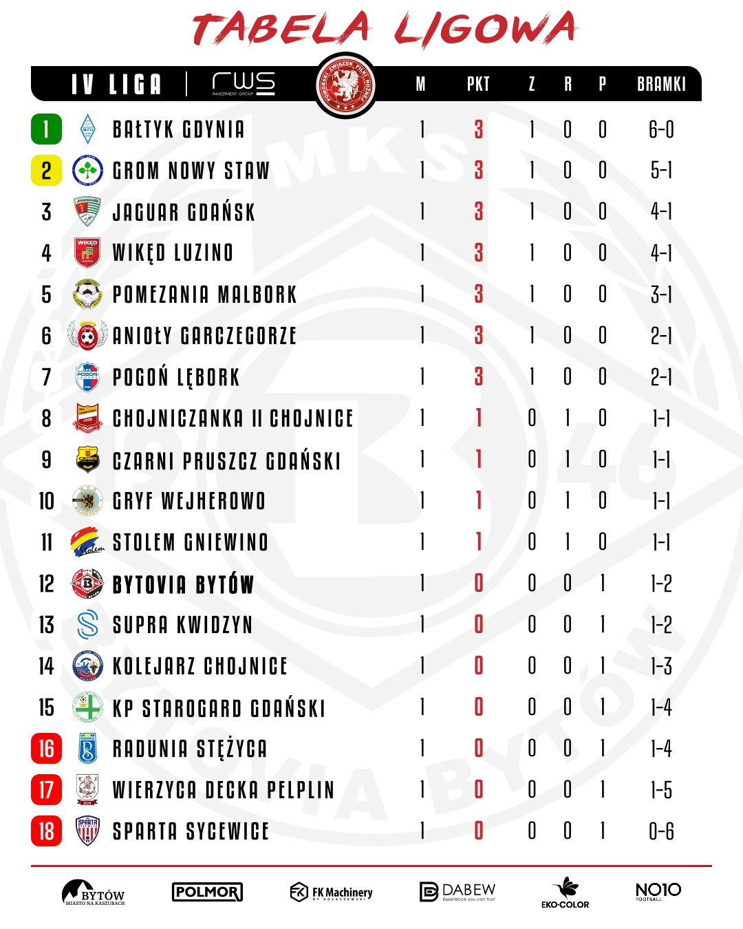 Seniorzy IV LIGA / TABELA LIGOWA PO 1 KOLEJCE 6 sierpnia 202492954 IV LIGA / TABELA LIGOWA PO 1 KOLEJCE W obecnym tygodniu rozegramy kolejny mecz domowy: – Piątek (09.08) – Bytovia Bytów vs Chojniczanka II – Godzina 18:30 – Bytów – boisko główne