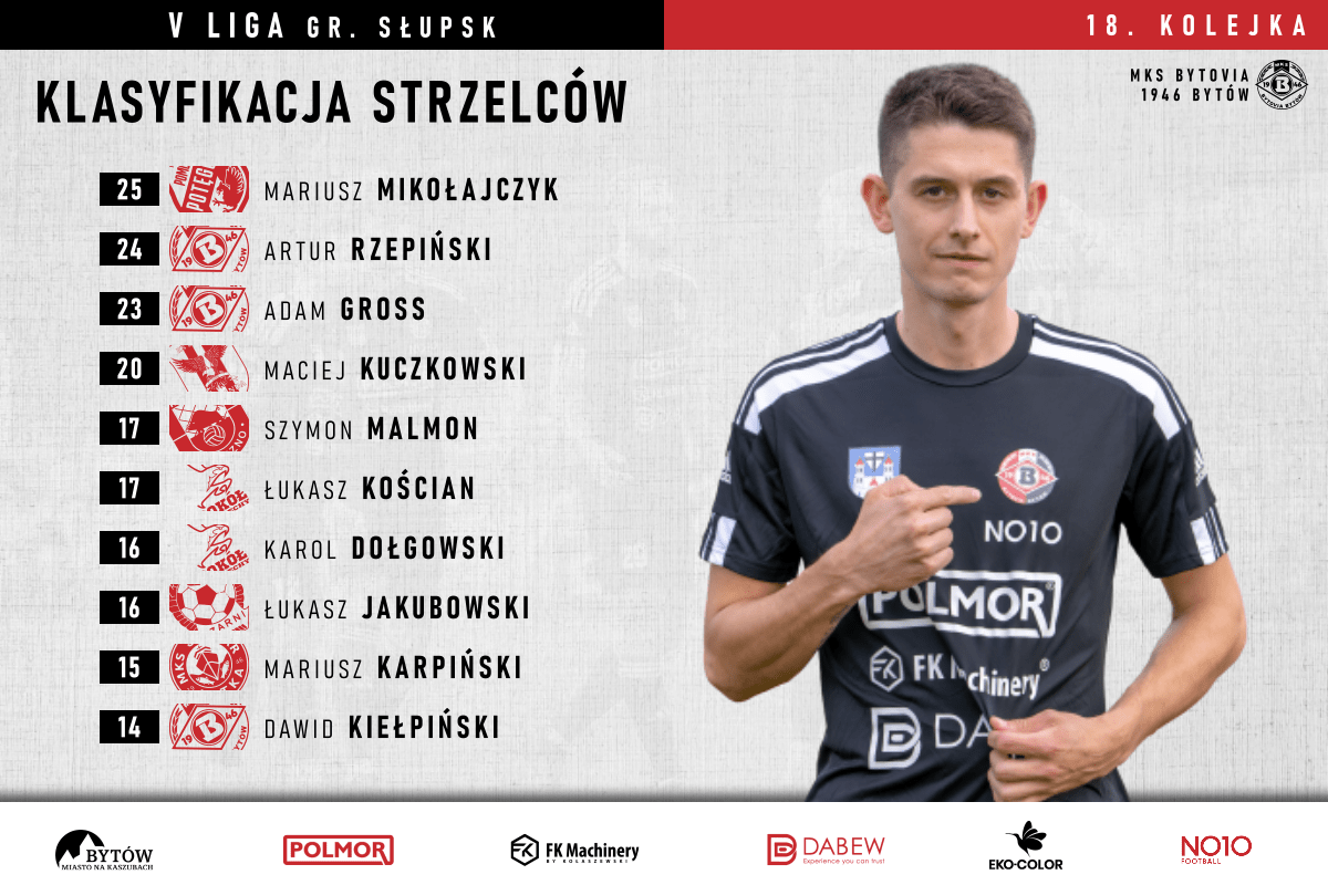 Na grafice liderzy klasyfikacji strzelców KEEZA V ligi Pomorskiej, a w TOP10 aż 3 zawodników naszego zespołu z łącznym dorobkiem 61 bramek!